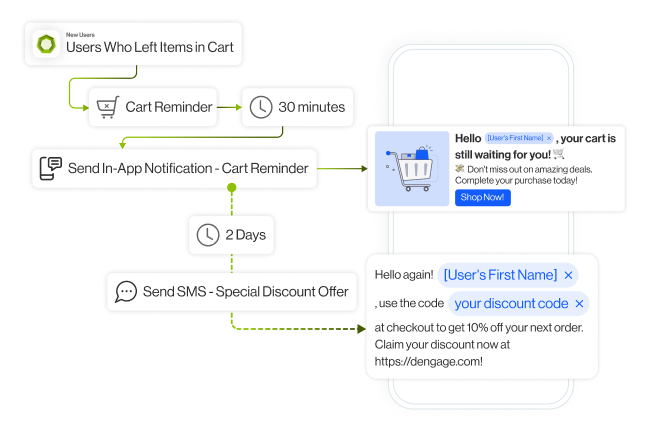 Respond instantly to what users do or don’t do, from cart abandonment to app inactivity, with relevant, data-driven messages.