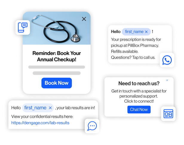 D·engage delivers native messages across email, SMS, WhatsApp, push notifications, onsite messages, and in-app channels so patients receive relevant guidance when they need it most.