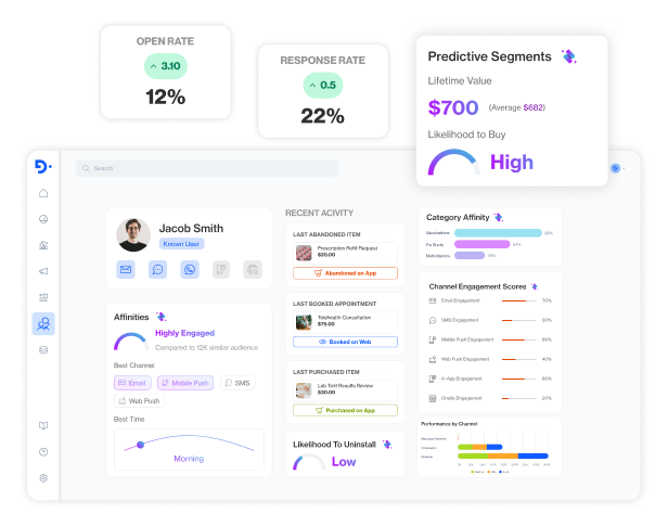 From appointment reminders to prescription updates and health tips, D·engage supports real time engagement across native SMS, WhatsApp, email, push, and in-app channels.